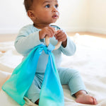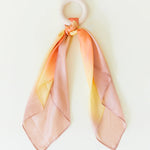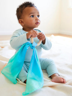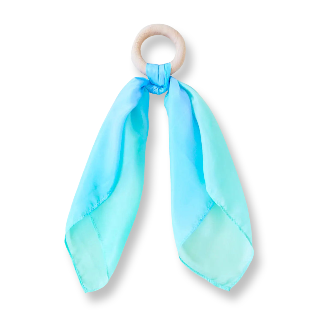 The Desert Baby Teether is a 3" diameter solid Maple wood ring with a 21" x 21" Mini Blossom Playsilk securely knotted onto it.