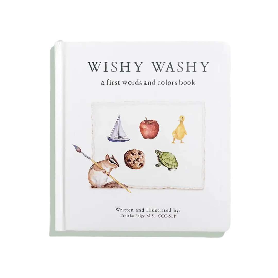Accelerate your toddler's education in first words and colors using this engaging board book designed by a professional artist and licensed speech therapist. Wishy Washy takes your young child on an adventure as they learn new words through life-like paintings, bright colors, and an animal friend who guides them along the way. Wishy Washy features strategically chosen first words that include a child's earliest developing sounds, such as m, b, p, t, etc.