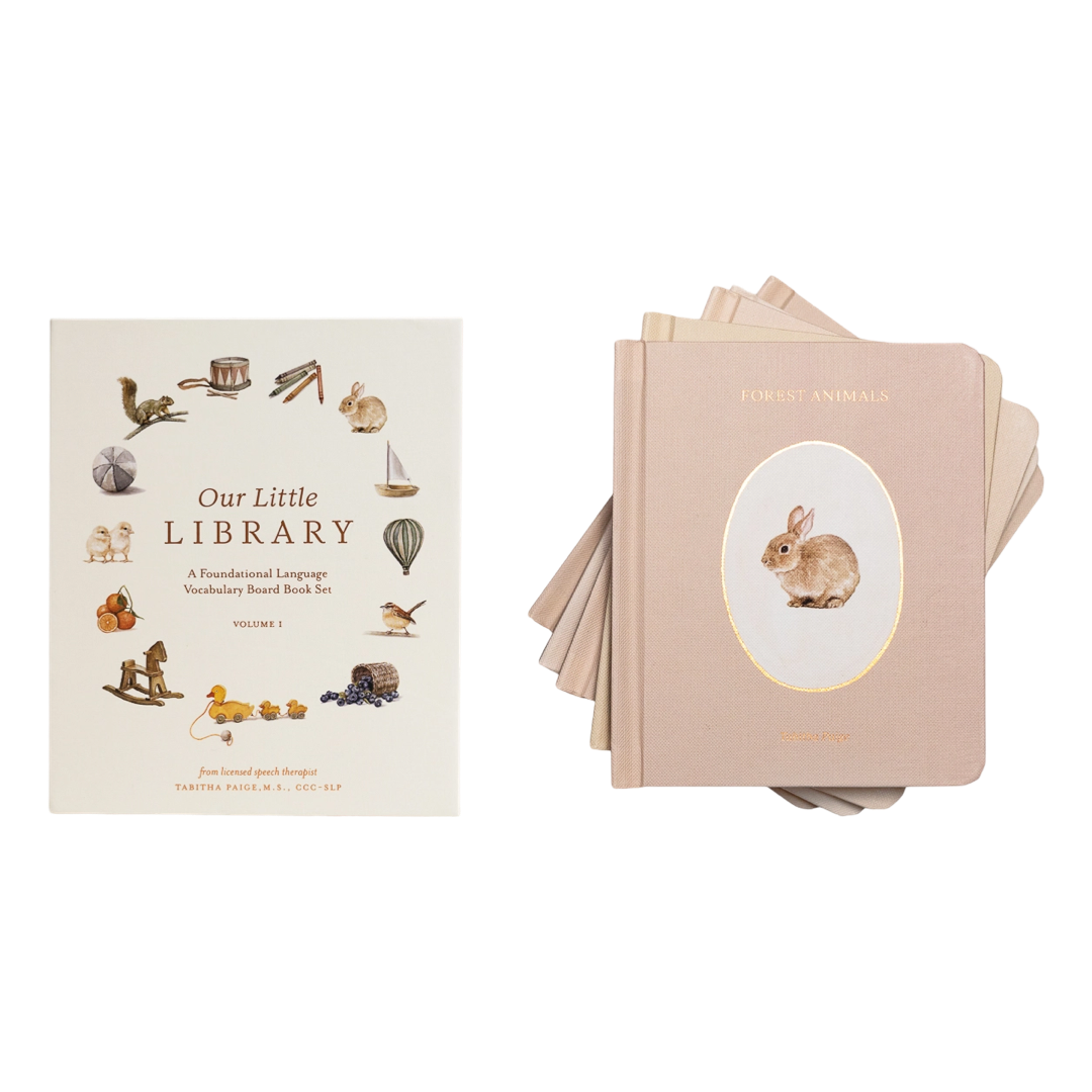 Jump-start baby's exposure to first words using this beautifully designed board book box set—the perfect gift for newborns and baby showers! Designed by a professional watercolor artist and licensed speech therapist, Our Little Library features five board books that feature charming images and foundational vocabulary that will help you build your child's vocabulary. The durable materials and small book size also make them perfect for your baby's little hands.